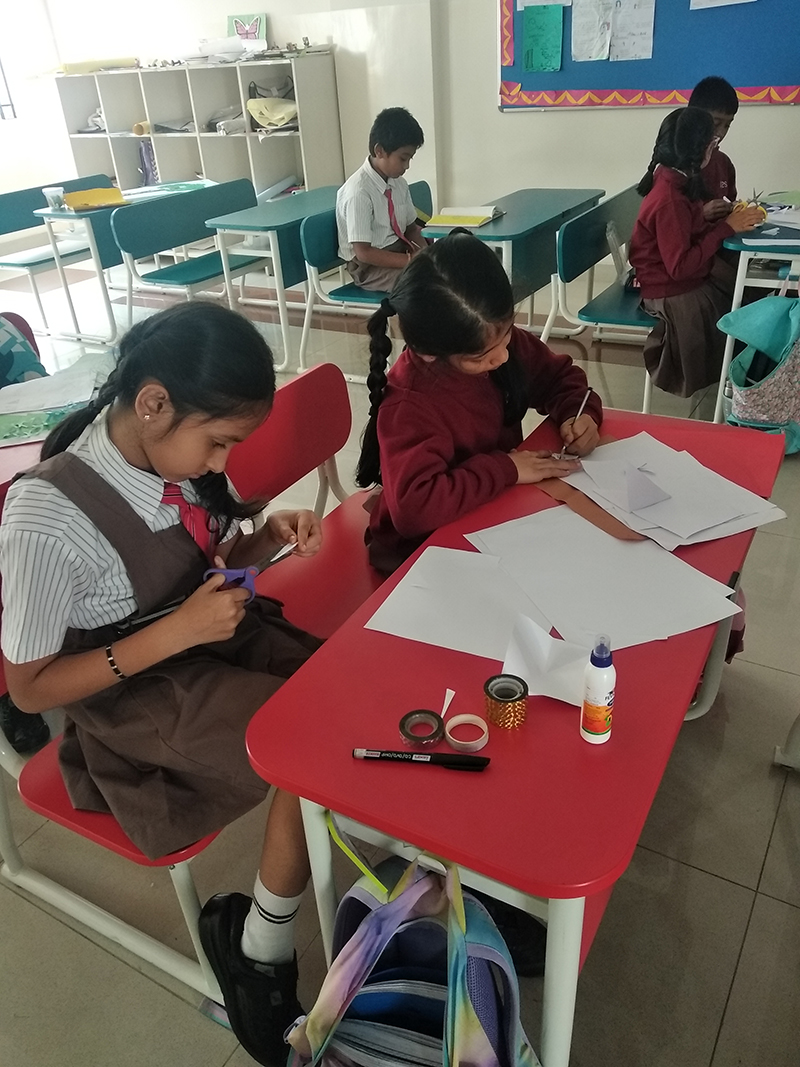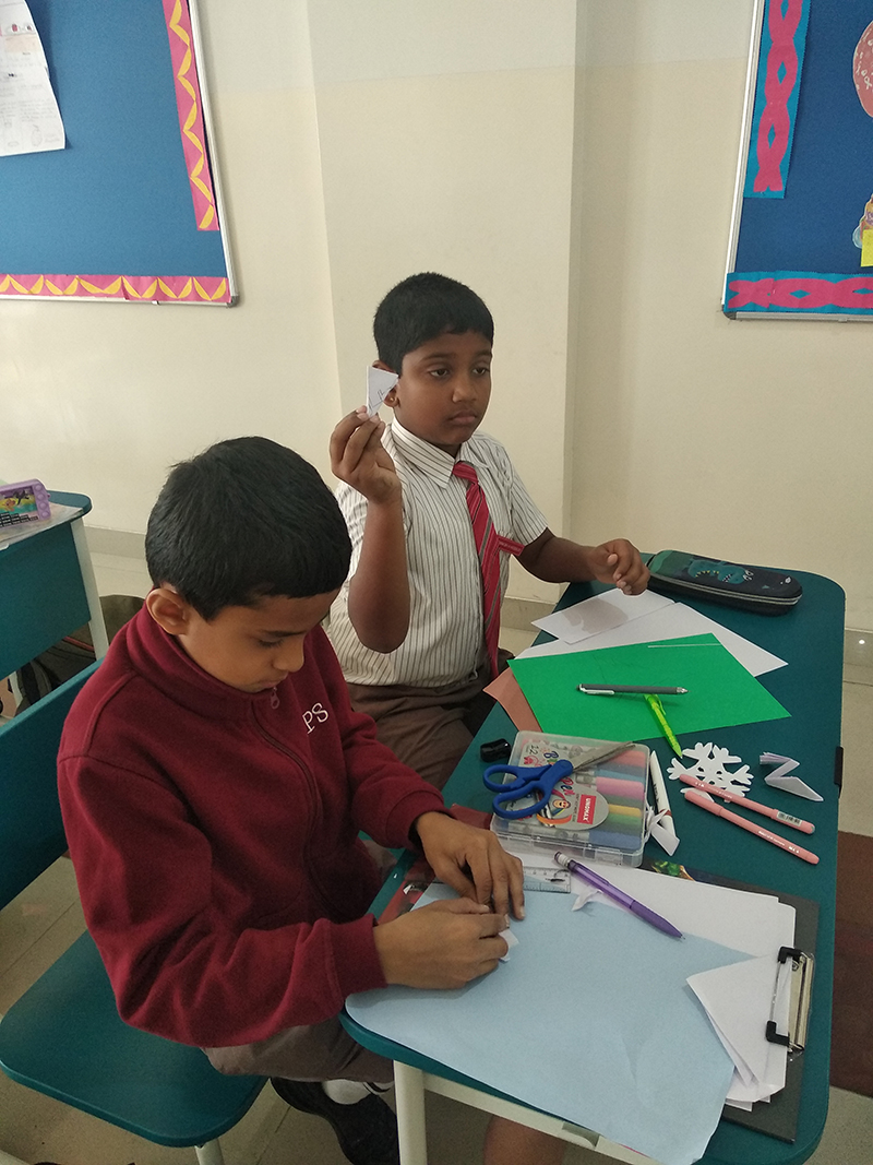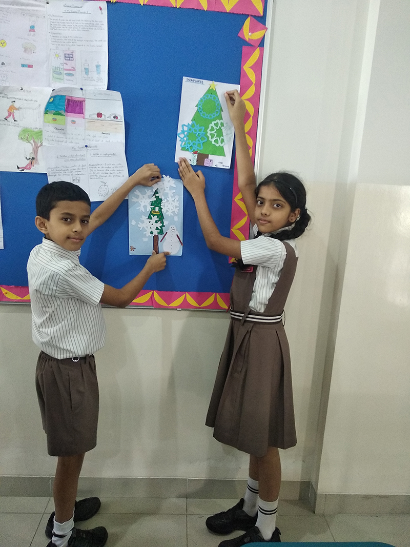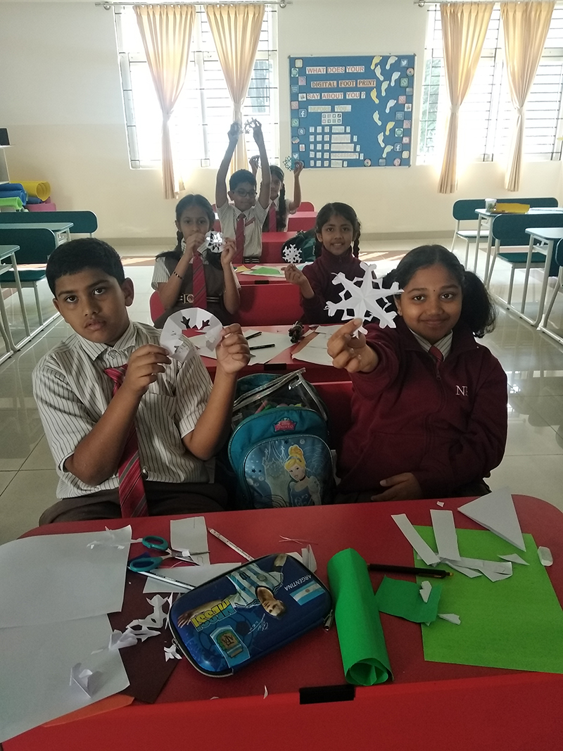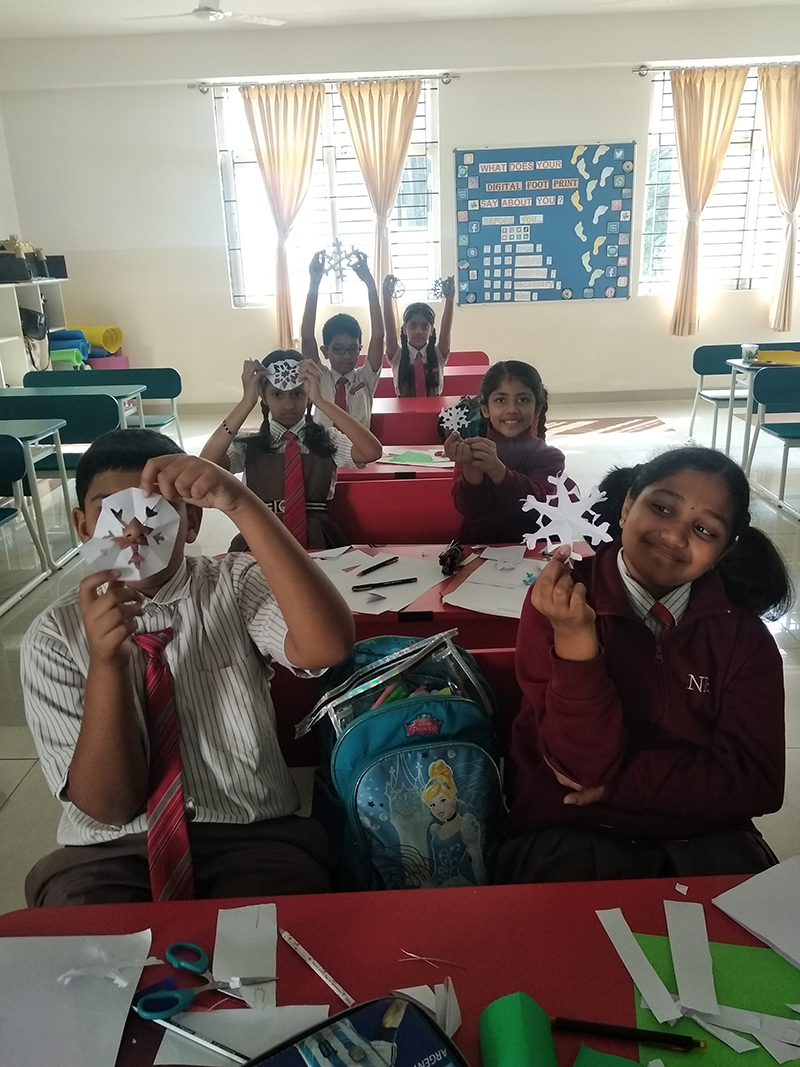 Integrating art with science, students engaged in crafting snowflakes using white A4 paper. Following teacher instructions, they created intricate designs, turning a simple art activity into a fascinating exploration of snowflake formation.